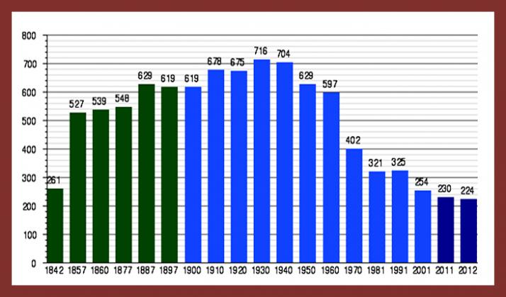 En este grafico podemos ver perfectamente, la evolución demográfica de Rapariegos, desde hace ciento setenta años. De 1842 a 1930, la población fue aumentando progresivamente, hasta llegar en 1930, al pico más alto en número de habitantes residentes en Rapariegos. A partir de 1930, esta población fue disminuyendo con la fuerte emigración y hoy ya en 2014, habrá poco mas de 200 habitantes censados en Rapariegos, triste pero real. Como la Unión Europea no ayude a las zonas rurales y trate de darlos...