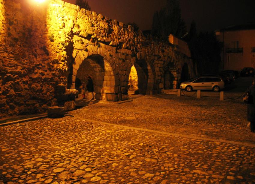 acueducto aparecen 36 arcos apuntados, reconstruidos en el siglo XV para restaurar la parte destruida por los musulmanes en el año 1072. En el piso superior, los arcos tienen una luz de 5,10 metros, con los pilares de menor altura y grosor que los del piso inferior. El remate es un ático por donde discurre el