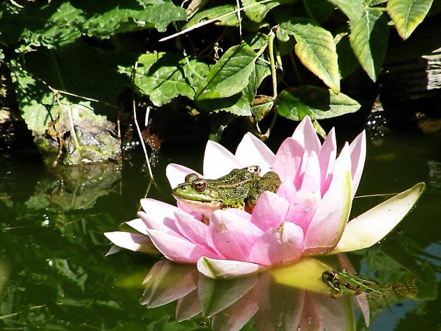 No será un principe, pero esta ranita si parece estar "encantada", ocupando el trono rosado que, como vemos, tiene otros pretendientes en el estanque del