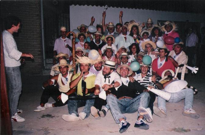 Dias de vino y rosas. Nos aburriamos, jo, como nos aburriamos, eran unas cenas insoportables. Esta fué la primera cena de fiestas como "Peña el Sombrero", origen de lo que al año que viene será la lamentable comisión de fiestas, que la Virgen de Valverde nos ampare. En esta cena estábamos, me salen, 34, contando con que no veo en la foto al José, que se había ido ha abrir el chiringuito, Aurorita, que raro que la salsera de mi prima no estuviera en primera fila, y el Sixto, este ya lo entiendo mejor,...