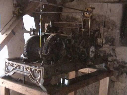 Aquí vemos la maquinaria del reloj de la torre. No se si ahora está en marcha o parado. Lo digo porque la última vez que estuve en Deza de vacaciones estaba parado pues hay que subir a menudo(?) a darle cuerda manualmente y posiblemente estviese el encargado de veraneo, también. Hace años era una obligación del sacristan; pero al quedar la parroquia sin él, se hizo cargo el Ayuntamiento y era el alguacil el que lo hacía. Como dato curioso se puede decir que esta maquinaria está fabricada en Roquetas...