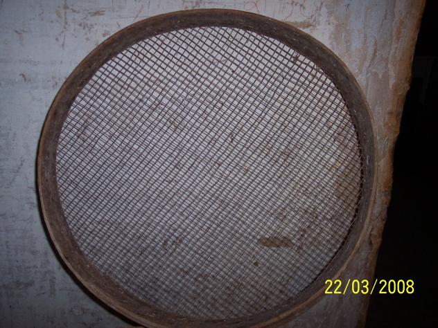 Nosotros la medida de la malla de la criba la medíamos de otra manera pues con decir garbancera ya sabías que por allí pasaban los garbanzos y se quedaban los palotes. Para quitar la tierra de los garbanzos se usaba un arnero y los garbanzos se quedab en la criba y la tierra caía al suelo. Todo era cuestión de práctica.