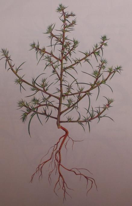 Un abrazo. Uno de los nombres de esta planta, le viene por su facilidad de clavarnos alguna espina y por eso también se llama, espinardo. Las hojitas que protegen sus flores son delgadas y duras y acaban siendo pinchosas. Y hablando de espinas, me viene a la memoria aquellos políticos, si se pueden llamar así, que en un viaje por Tierra Santa se probaron una corona de espinas, se sacaron fotos y encima se mofaron algo o mucho, haciendo comentarios jocosos. No tendrían que ir tan lejos si es que lo que buscaban... Buenos días Deza y amigos del foro: Esta mala hierba que veis en la fotografía se llama científicamente SALSOLA KALI, mas el vulgo la llamamos Barrilla pinchosa, Correcaminos, Roones, Espinardo y en nuestro pueblo, Capitana. Es una planta que germina en primavera y que se aparece agazapada en los sembrados hasta después de la siega. Allá en agosto cuando la luz le da de lleno, acompañada con el agua de alguna tormenta (que suelen ser seguras) se alza, tal como regada por aceite, que se dice y se...