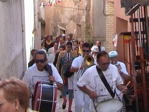 Al carpintero Bernando habrá que regalarle un sombreo o una gorrita, nuevo. Siempre va con el mismo año tras año como si la carpintería no le diera para cambiar ese adefesio de gorro que lleva. Bueno a mi me importa poco pero me gustaría que tuviera otro "look" pues a los hombres de mi pueblo los quiero ver bien guapos y éste es uno de ellos. Saludos de una dezana que añora mucho su pueblo. Besos... El torero de la fotografía es Serafín Marín, y el del sombrero blanco que vuelve la cabeza el Bernardo. La charanga tiene otra función que la orquesta y es la recorrer todas las calles alegrando a los vecinos y acompañando a los toreros a la plaza y en la plaza. Es la que alegra la tarde de toros con sus pasadobles toreros en donde los diestros se recrean con el morlaco, pase va y pase viene. Y es que creo que hasta el toro se mueve al son de esta música tan espoñola ¡Olé...! Un abrazo del abuelo. A la derecha de la foto, se ve aparcada la mulilla, para arrastrar los toros.