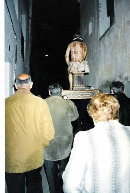 La imagen del Ecce Homo, en Deza. Se pueden apreciar los desgarros que el imaginero quiso plasmar en la espalda de Jesús, después del tormento de los azotes a los que fue sometido. Camino de la Solana, la noche de Viernes Santo, se dirige a hombros de sus cofrades, a la ermita de la Soledad. Destrás vienen el Nazareno y la Madre con su Hijo muerto en brazos. Un saludo.