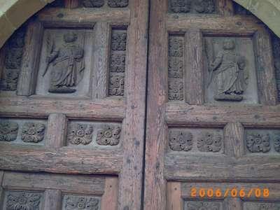 Una puerta de madera en muro de piedra,