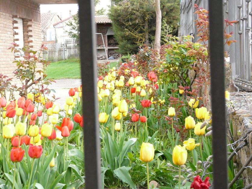 Un patio repleto de tulipanes,
