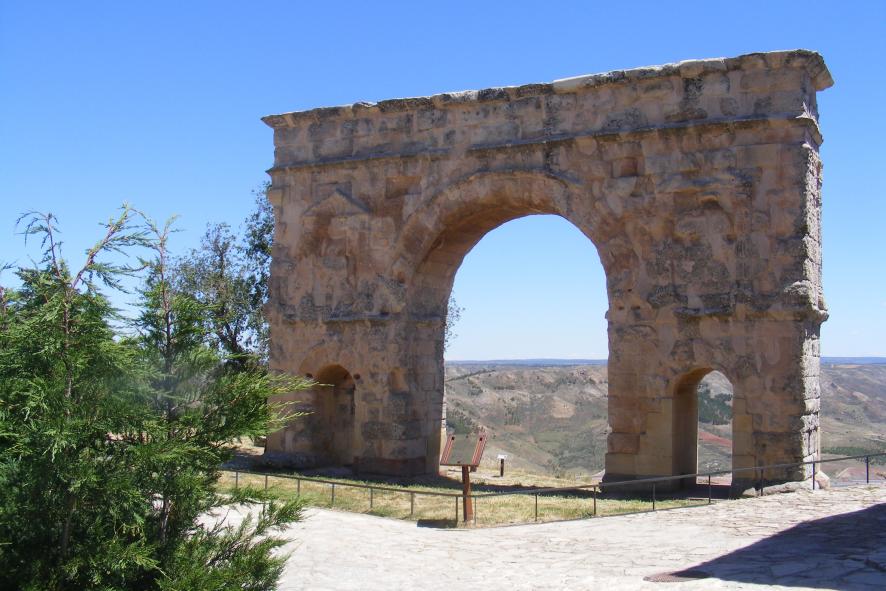 Mirando al paisaje a través del arco romano,