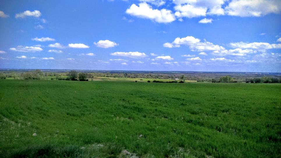 La Dehesa: Trigales en primavera, bajo el sol y un mar de nubes blancas,