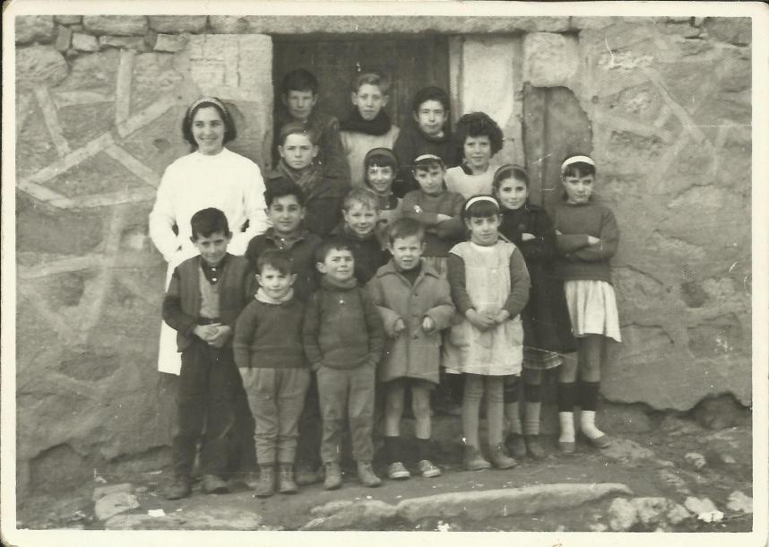 Si comparamos esta foto con la foto similar, realizada ocho años antes, podemos ver como ha disminuido el grupo de alumnos, solo uno de aquellos pequeños niños, Sebastián, está en esta foto, eso pone de manifiesto la tremenda espantada, el abandono, la migración que se produjo en aquellos años de los