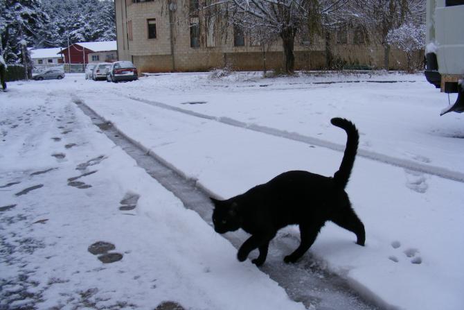 Gato paseando por la nieve,