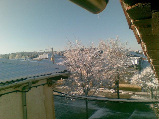 Tejados y acacias nevados,