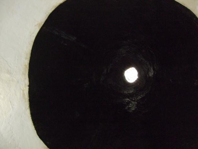 Esta es una toma hacia arriba en la que vemos como se va reduciendo el cono y la luz que entra por la parte superior donde se coloca el sombrero o cierre con tablas. la parte que vemos en blanco esta con faldege el negro es el hollín que va quedando.