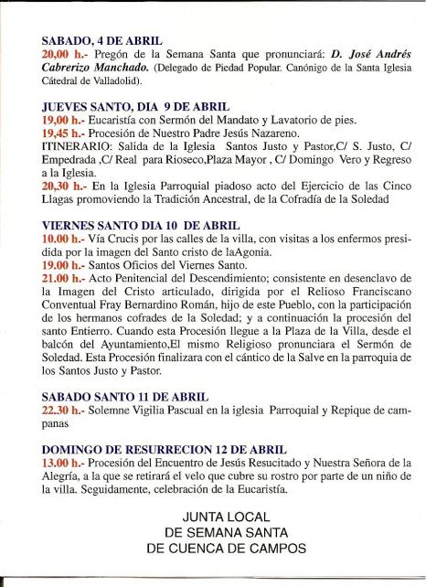 Estoy agradecido a la persona que haya puesto el programa de Semana Santa, ya que es la única manera de saber de ella, pués parece que en Cuenca no se hace propaganda, carteles, u otras informaciones que nos lleguen a los que vivimos lejos de nuestro querido pueblo. Muchas gracias por tu información, manera de enterarnos los que vivimos fuera de lo que pasa o va a pasar en nuestro pueblo.