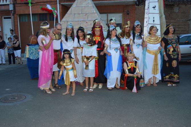 Componentes de la cabalgata con la carroza reproduciendo las pirámides del antiguo