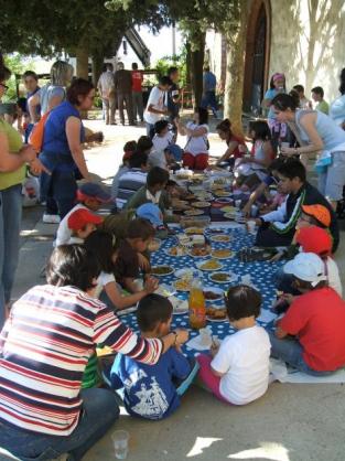 Todos los niños y mayores celebrando curieses en la pradera de la