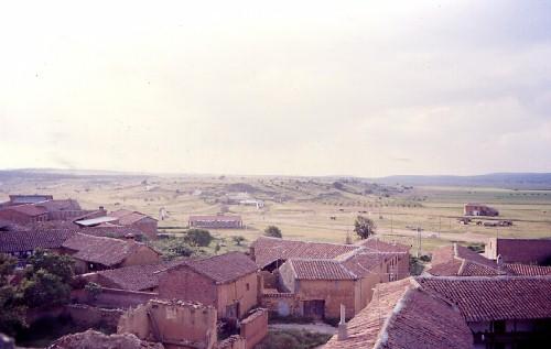 Al Noroeste ( no al Noreste) se ven las escuelas que hoy están inoperativas por falta de niños . Sirven de refujio a una bonita peña formada por jóvenes del pueblo y de otros pueblos cercanos. Al fondo vemos el molino harinero de " Pernales" y en primer plano , la casa que fuera del " Tí Secundino". ¿Casas de adobe o de tierra prensada?. En realidad, la forma de construir estas paredes, consistía en hacer un armazón o molde de tablones de madera. Después se vertia una tierra especial y algo humedecida, a la que se le aplicaba presión a base de mazazos. Luego se retiraban los tablones, y ya quedaba hecha la tapia. Carretera que va a San Esteban de Nogales. Hacia el norte.Se puede ver al noreste , las escuelas , el molino y el teso de la horca.