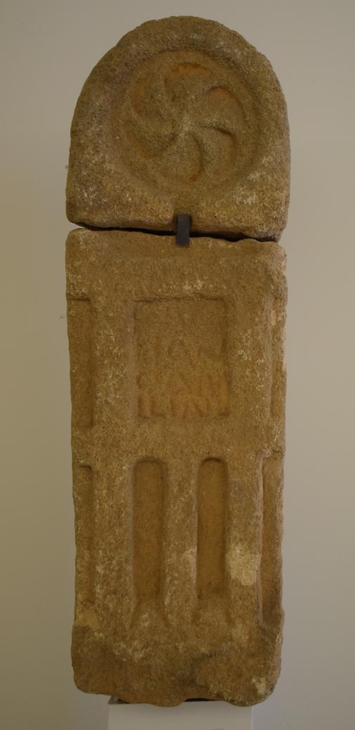 La cabecera está decorada con una rueda de radios curvos de dextrógiros, inscrita en circulo rebajado. El