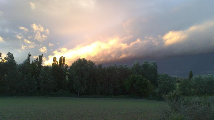 Hoy hemos tenido un atardecer tormentoso. Era un contraste de colores: la oscuridad que venía de Venialbo se "echaba encima" de los últimos rayos del día en un cielo parcialmente despejado. Por la calidad de la foto no se aprecia, pero ha sido realmente impresionante. Finalmente, terminó con un chaparrón acompañado de granizo.