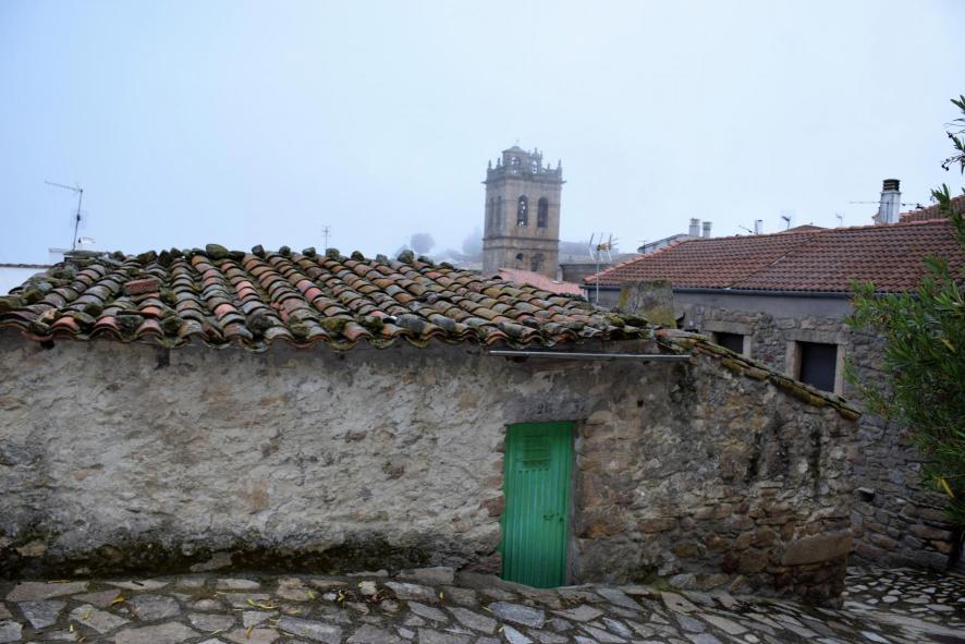 La torre de la iglesia sobresaliendo por encima de los tejados,