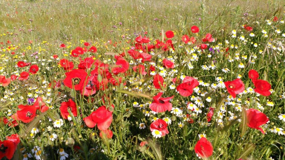 Amapolas y margaritas pintan en mayo los prados,