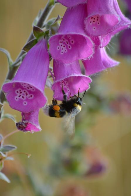 Una dedalera, con su correspondiente abejorro, en plena faena.