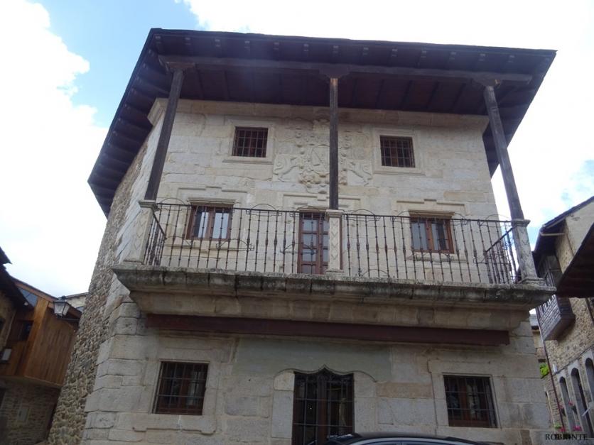 piedra labrada, balaustrada de hierro forjado y vigas de madera.