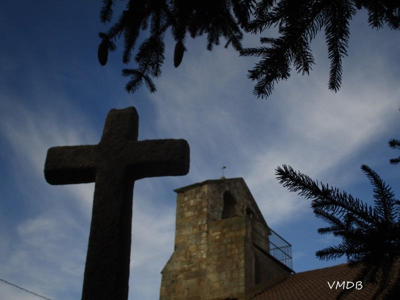 La cruz de enfrente de la iglesia y el campanario,