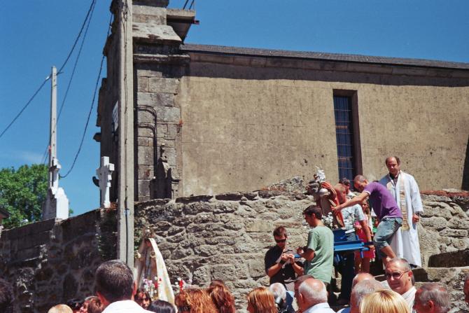 calle de la población La misma es acompañada por los fieles y devotos, y amenizada con el grupo folclórico musical de la aldea gallego-orensana de Villa Vieja.