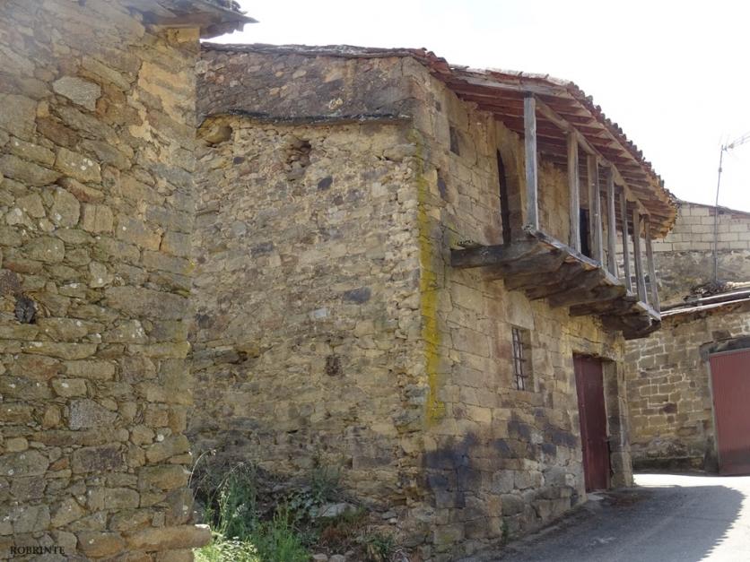 de sillería y sillarejo, muestra dos alturas, una balconada de madera recorre la planta noble, está muy deteriorada faltando la balaustrada del quitamiedos.