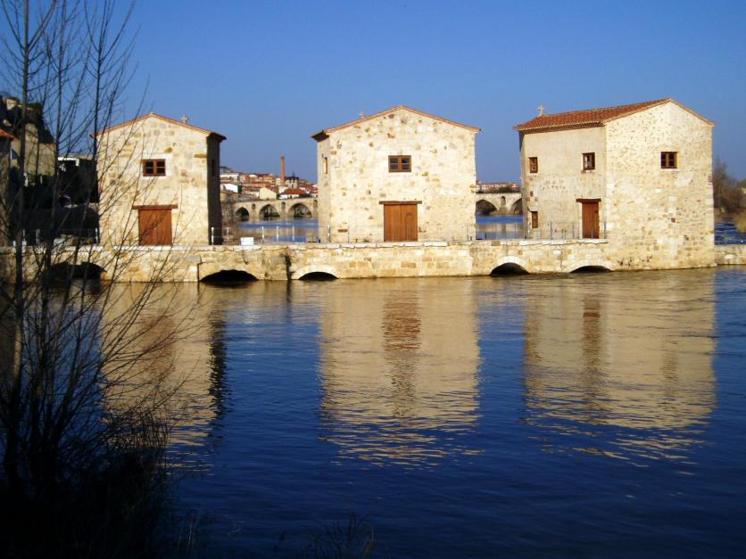 Aceñas de Olivares sobre el Duero, y puente medieval al fondo,