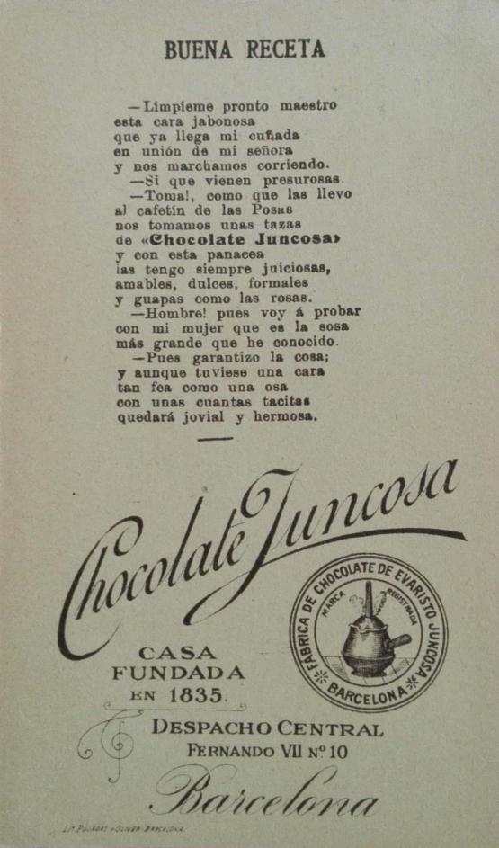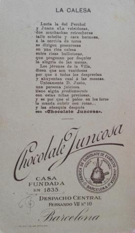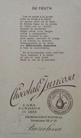 Barcelona, en 1.910. Los poemas del reverso de la tarjeta mezclan los estereotipos sobre Andalucía con la publicidad de su chocolate.