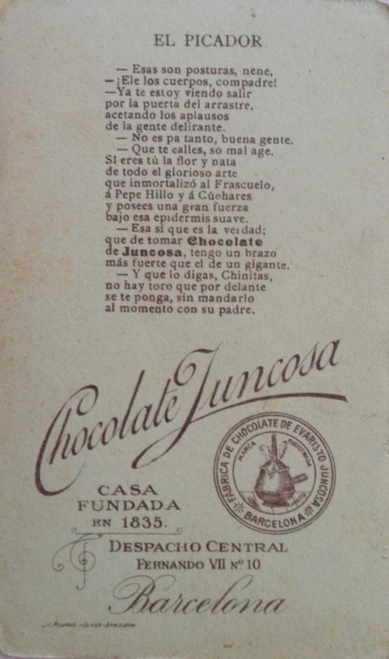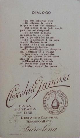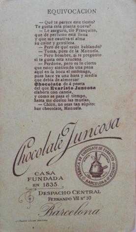 Barcelona, en 1.910. Los poemas del reverso de la tarjeta mezclan los estereotipos sobre Andalucía con la publicidad de su chocolate.