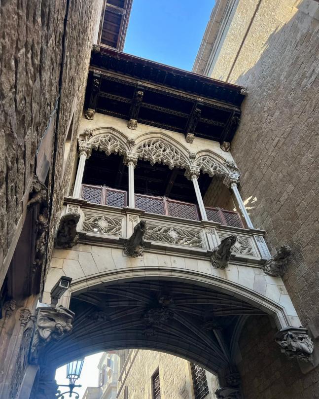 Balcones en la calle Bisbe del barrio gótico Barcelona,