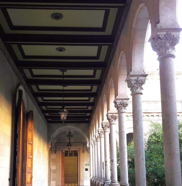 Al igual que en el Claustro de Letras de la Universidad de Barcelona, las arcadas presentan finas columnas acabadas en bellos capiteles corintios, cada uno de ellos esculpido de forma diferente. El techo está revestido con paneles de madera.