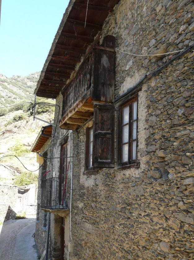 Un balcón de madera y otro con barandilla metálica,