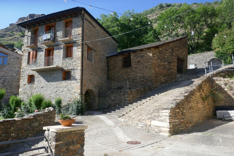 Gran escalera y rampa en el centro del pueblo,