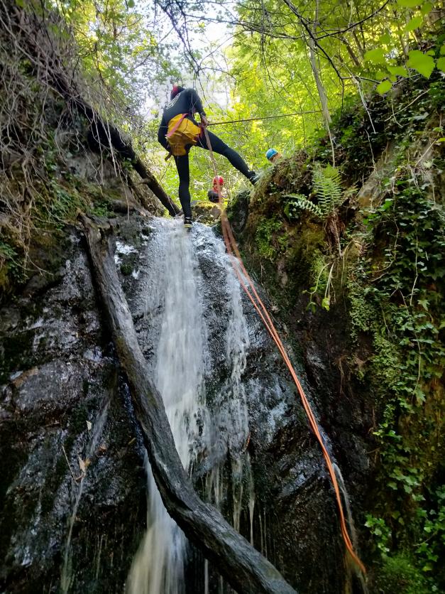 Asomandose a la cascada rapelando en el Burgo,
