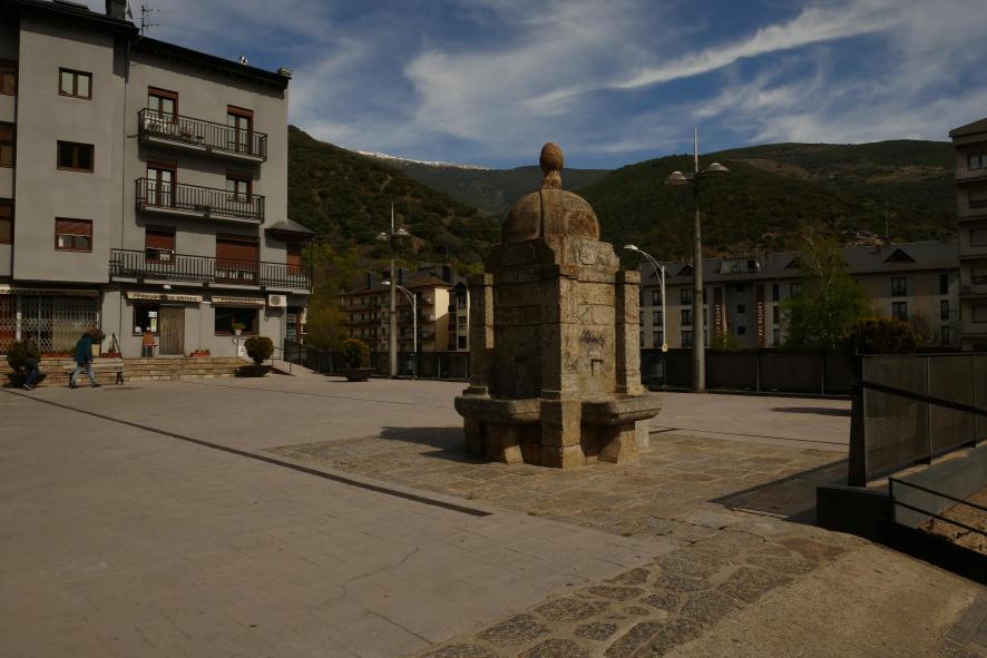 Plaza frente a la iglesia con fuente,