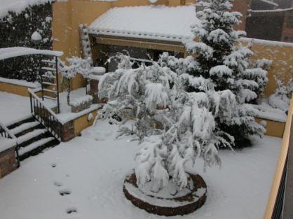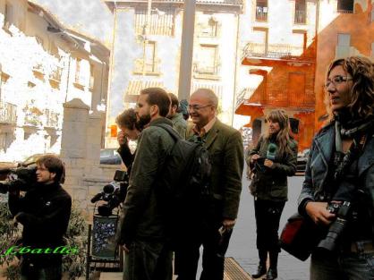 La plaça de la vila plena de periodistes tot esperant l'arribada del President de la Generalitat, sr Montilla