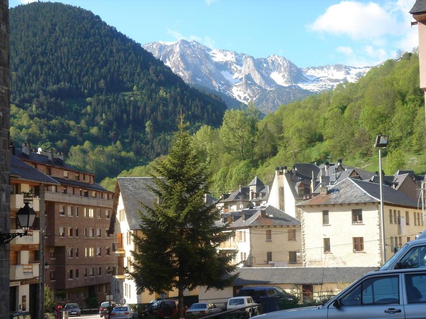 Pirineo catalán nevado, montañas y casas típicas,