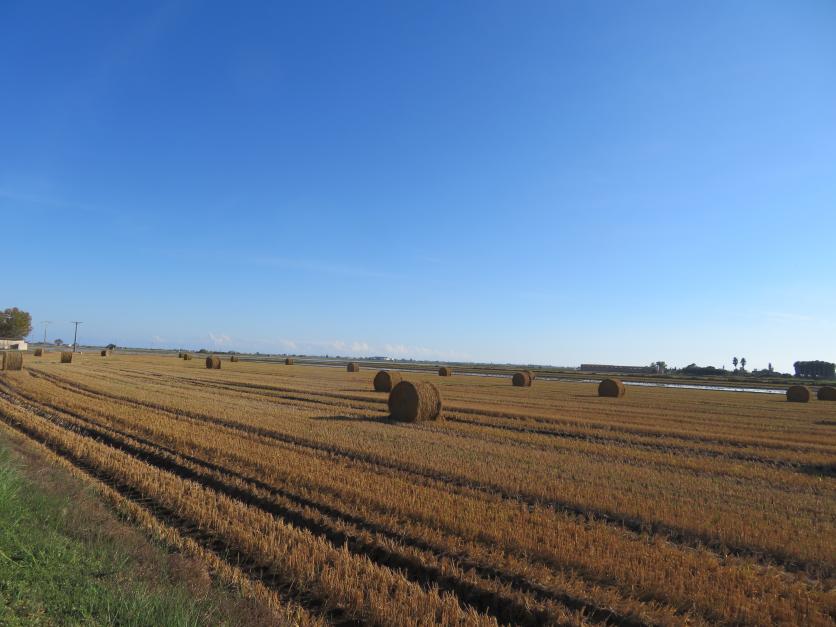 Arrozal cosechado, rastrojo y balas de paja de arroz,