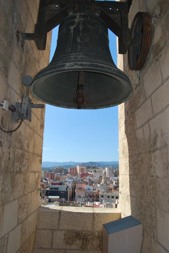 El campanario, también de estilo gótico es obra del arquitecto maestro Benet Otger de Lyon, su construcción se finalizó en el año 1566. Está situado a los pies del edificio del templo. Es una torre elevada, con siete plantas cubiertas con bóvedas de crucería, tiene una altura de 62 metros, con planta hexagonal de doce metros de ancho, dividido en seis cuerpos y coronado con contrafuertes y pináculos pequeños, se conservan en su interior cuatro campanas, repuestas después de su destrucción durante la guerra civil española.