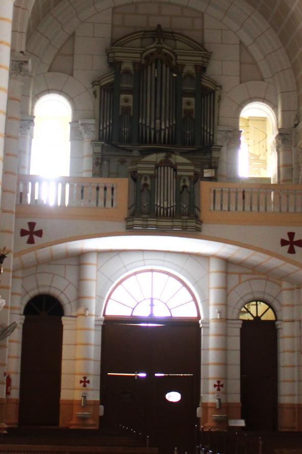 Arquitectura del mueble: El instrumento se encuentra alojado en una caja de madera que armoniza con el estilo neorrománico del interior de la iglesia, presentando una disposición clásica con