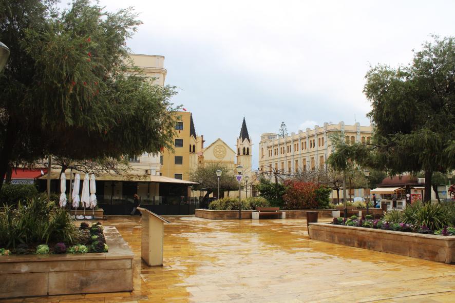 color claro a la derecha de la iglesia presenta el estilo arquitectónico característico del centro de la ciudad. Entorno: La plaza cuenta con jardineras de