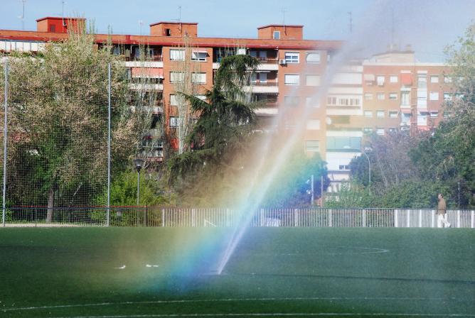 Campo de fútbol regado,