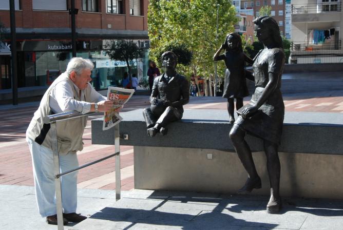 Informándose junto monumento a la familia,