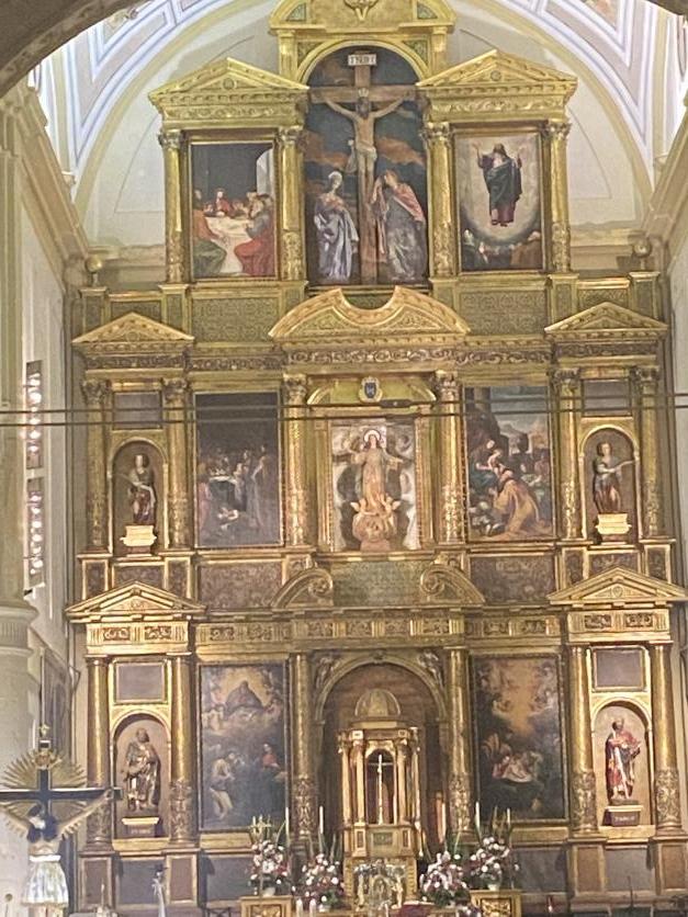 columnas que dejan paso a tres espacios, para tallas y pinturas, fue construido por Alonso Vallejo y Juan Muñiz, de 1612 a 1615, en importante madera, ensamblaje y talla, todo dorado y con buenos estofados.