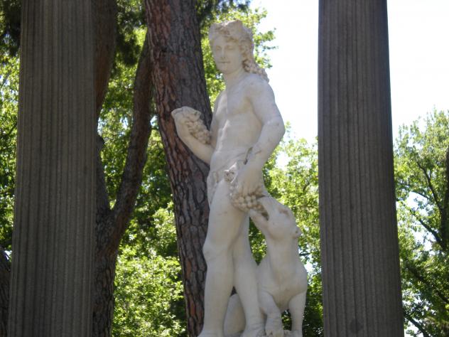 joven de complexión atlética, y un felino, posiblemente una pantera. La figura humana tiene el pie izquierdo adelantado y el torso girado ligeramente también hacia la izquierda así como la cabeza, tocada con racimos de uvas que le caen por la espalda como si fuera el cabello. El brazo derecho se dobla llevando la mano a la altura del pecho que agarra un racimo de uvas. El brazo izquierdo por el contrario permanece extendido a lo largo del cuerpo y sujeta en la mano otro racimo de uvas. El felino se enrosca por detrás de la figura humana sentado sobre sus patas traseras, con la pata derecha delantera alzada para no pisar el racimo de uvas que se encuentra debajo, mientras, con la boca, intenta mordisquear las uvas que lleva en la mano izquierda la figura humana. Como dato curioso el sexo del joven queda oculto por una hoja de parra que proviene del racimo que sujeta con la mano izquierda.