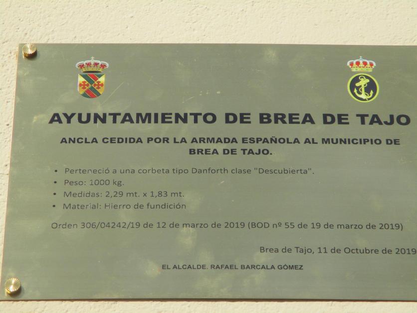 Placa recordando la cesión del ancla de la Armada al Ayuntamiento,